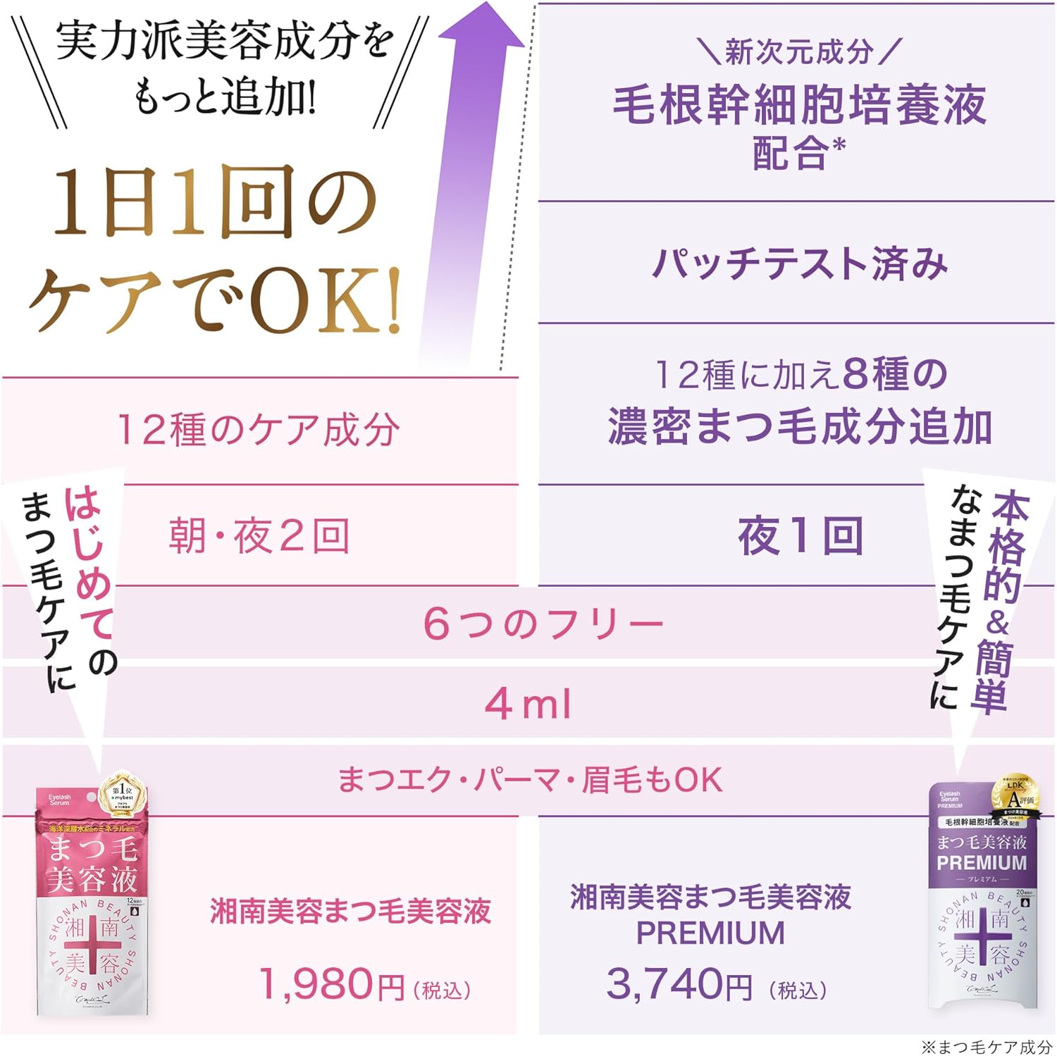 湘南美容 幹細胞睫毛精華液Premium 4mL 🇯🇵日本製造🇯🇵 [ 從根源喚醒,綻放極緻濃韌美睫 ] 告別稀疏短小!革新性專業級睫毛養護精華。我們以尖端生物科技,直擊美睫生長的根本。 ▍核心修護科技 獨家添加「毛根幹細胞培養液」,富含高濃度營養與生長因子,能深入毛囊,有效: ✅ 喚醒休眠毛囊,促進新生。 ✅ 延長睫毛生長期,讓睫毛長得更長。 ✅ 強健睫毛韌性,改善脆弱易斷問題。 ▍權威雜誌認證 本品榮登日本最具公信力的 《LDK the beauty》美容評鑑,在實驗實測中,於「效果」、「成分」、「使用感」方面獲得高度評價,是備受推薦的實力派美睫單品。 ▍極致舒適體驗 輕透如水感的質地,速效滲透不黏膩,更無香料、無色素、低刺激性,連配戴隱形眼鏡者與敏感眼族群也能安心使用。 ✨ 追求真正的效果,就從養護開始。✨ 無需接睫,也能擁有自然生長的濃密、纖長、強韌美睫! ⭐️使用方法: 每晚清潔眼部後,像畫眼線一樣,將精華液均勻塗抹於上睫毛根部。待其自然吸收即可。