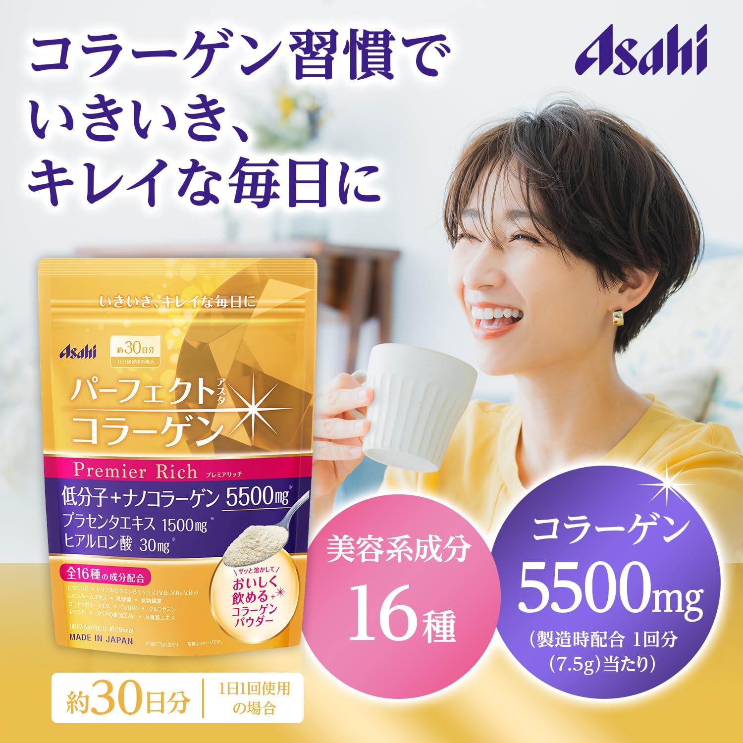 ASAHI朝日 金裝加強配方 低份子膠原蛋白粉+玻尿酸+Q10 228g30日量/378g50日量 ~日本製~ 各種品牌的膠原蛋白中,這是一款復合最全的美容保健食品,且采用最易於人體吸收的低分子膠原蛋白,一次攝取,保持每日美麗容顏。 膠原蛋白是女性美容的話題成分,可是大多數人沒有意識到,如果不能被身體吸收的話,即使每天再多的食用也是沒有效果的,所以再選擇膠原蛋白的時候,一定要選擇低分子膠原蛋白。 人體內每天約有2000mg的膠原白蛋白被消耗掉,本產品每日食用量約7.5g,約含有低分子膠原蛋白5500mg在內。 膠原蛋白是維持皮膚與肌肉彈性的主要成分,肌膚中的膠原蛋白會隨著年齡的增長漸漸流失,人的皮膚會陸續出現皺紋,而皮膚所需的是一種由三個氨基酸份子組成的「三肽氨基蛋白」。可是,人體的消化酵素卻難以將一般膠原蛋白分解成「三肽氨基蛋白」。 為了使人體能快速吸收,服用膠原蛋白飲品,能直接且快速的被身體吸收,再添加維他命C產品,可幫助身體更有效合成膠原蛋白並吸收。 ⭐️食用方法: 每日一匙:約7.5g 可以添加於水,果汁,咖啡,湯等任何飲品內,輕松服用把美麗留住,也可與任何食物放心的同時飲用,冷熱皆宜(水溫請勿過熱,約60-70度而上限)。