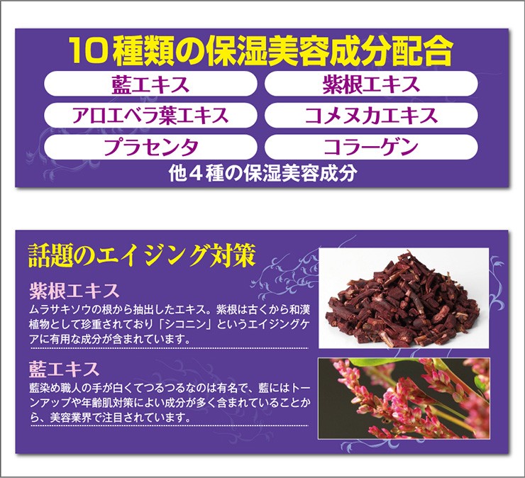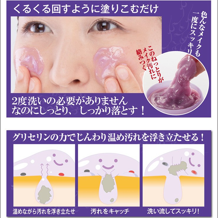 Chezmoi 藍紫根 保濕溫感卸妝啫喱 100g ~日本製~ 塗抹後會感到微溫,採用蓼藍和紫草根萃取精華,配合10種保濕美容成份,熱感卸妝實現肌膚負擔的最小化,能實現徹底卸妝,慢慢溫暖肌膚並讓污垢浮起。 成份蓼藍中富含有利於提亮膚色及抗衰老的有效成份,因為在美容界備受關注,而紫早的根部萃取精華,在日本及中國自古以來就被作為藥用植物而受到重視,其中含有紫草素成份對抗衰老非常有效。 ⭐️紫根: 從奈良時代日本就開始栽培紫根,最初只是作為染料使用,如今日本人越來越注重紫根的獨特功效,於保健品和化妝品中也開始使用紫根。 曾被日本的人氣節目"魔女們的22點"介紹過,一位實際年齡50幾歲的"魔女"卻擁有30幾歲女性的肌膚。其秘密就是使用紫根護膚。一個偶然的機會下發現紫根的神奇作用的。"魔女"在一次料理的時候被燙傷,然後馬上塗抹日本一種叫"紫雲膏"的燙傷藥。沒過幾天傷口就愈合了,而且不留疤痕。 "魔女"覺得"紫雲膏"很神奇,就開始研究紫雲膏的成分。發現主要成分是名叫"紫根"的藥材。可以促進細胞再生、防止色斑、暗沉、抗皺紋。在高級化妝品中已作為美白、抗老化成分使用。 然後"魔女"從漢方藥房買來"紫根",自己制作了紫根化妝水。僅使用了一個多月,臉部的皺紋和色斑就變淡了。於是"魔女"就開始長期使用,這就是"50歲"看上去像"30幾歲"登上電視節目的原因。 ⭐️使用方法: 卸妝時,取適量塗於乾爽的面部,由下至上輕輕按摩至溶解妝容(溶解眼妝時請小心入眼),再以溫水洗淨。