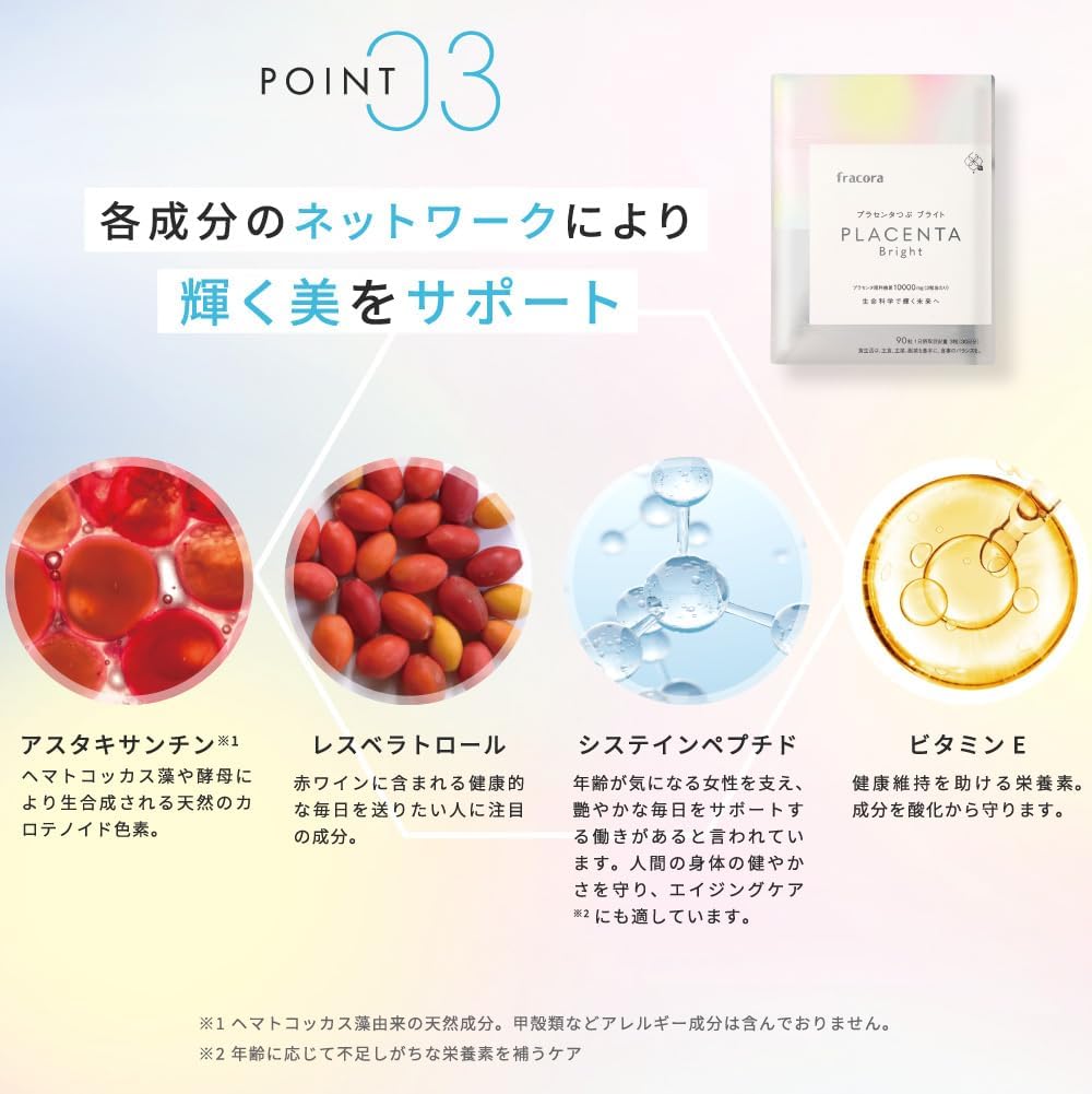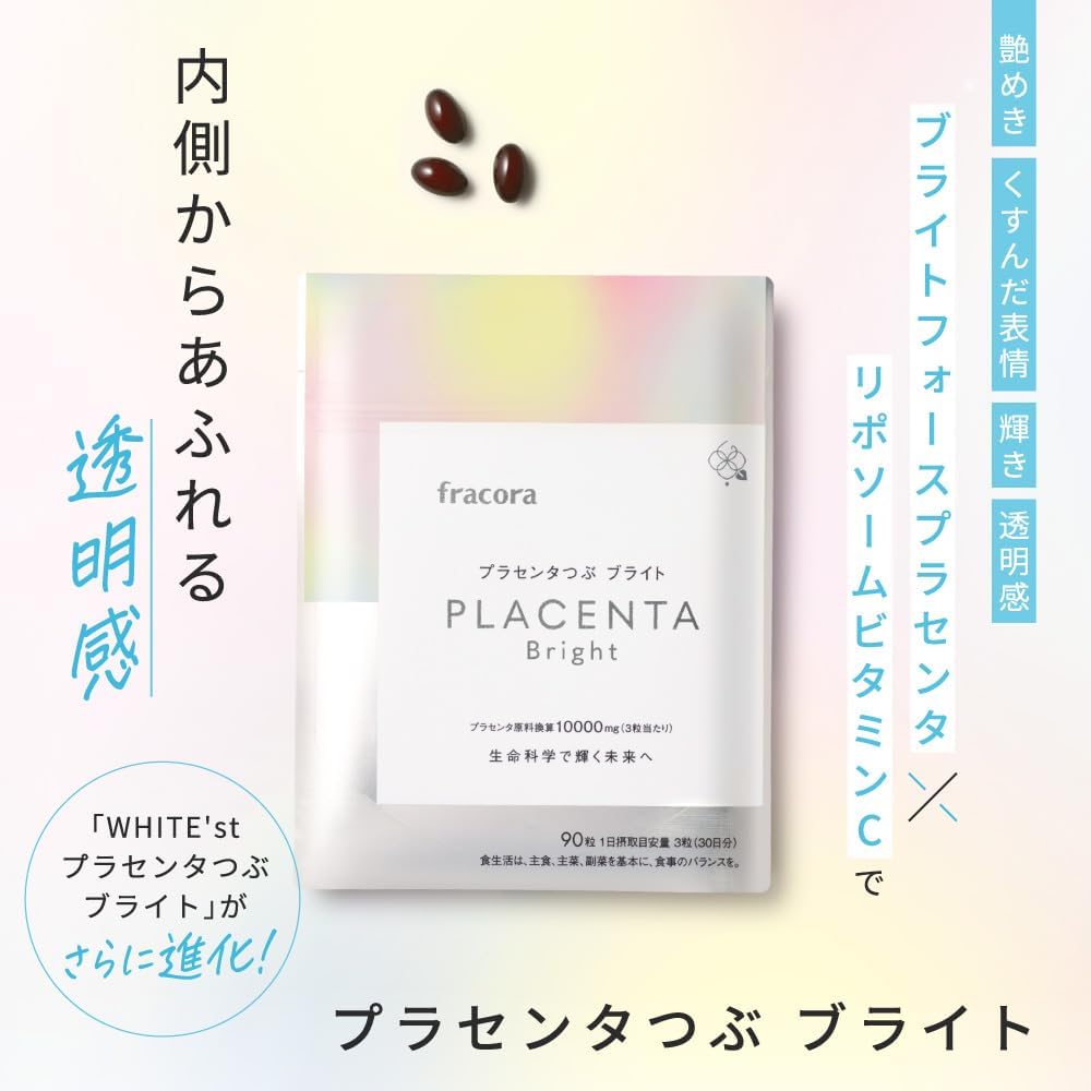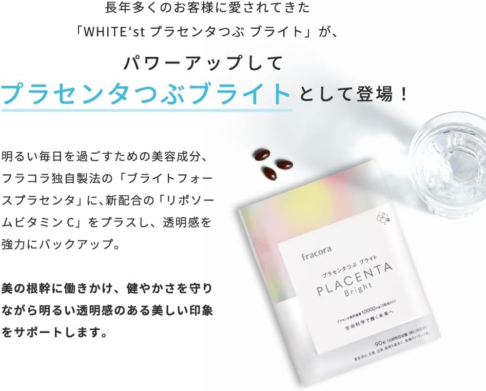 Fracora WHITE'st 升級配方 胎盤素美白膠囊 90粒30日量 採用了強化亮白的專利制法,胎盤含有亮白成分的同時,也被爆出含有促進黑化的成分(5種二肽)Fracora已經成功掌握了除去這個黑化成分,通過專利製法,成功製作出了強化亮白的純胎盤(含亮白力量的胎盤)。 獨創開發出具有抑制黑色素生成功能的“Bright Force Placenta”,可預防和改善斑點! “Bright Force Placenta”是一種獨創的原料,運用了抑制酪氨酸酶活性與聚合的專利申請技術。除了含有強化“Bright Force Placenta”作用的穀胱甘肽、白藜蘆醇、番茄紅素、蝦青素外,還添加了富含保護體內脂質免受氧化的維生素E和中鏈脂肪酸的椰子油,有助於締造澄淨透明感。 營養功能性食品(維生素E) ※維生素E是一種通過抗氧化作用,保護體內脂質免受氧化,輔助細胞維持健康的營養素。 本商品,隨著時間的經過,膠囊顏色有可能會變深。 這是由於配合的成分“酵母精華”的性質引起的,非品質問題。請安心食用。 ⭐️食用方法: 每日3粒以溫水服用,建議起床或睡前服用。 可以配合Fracora胎盤素膠囊服用。
