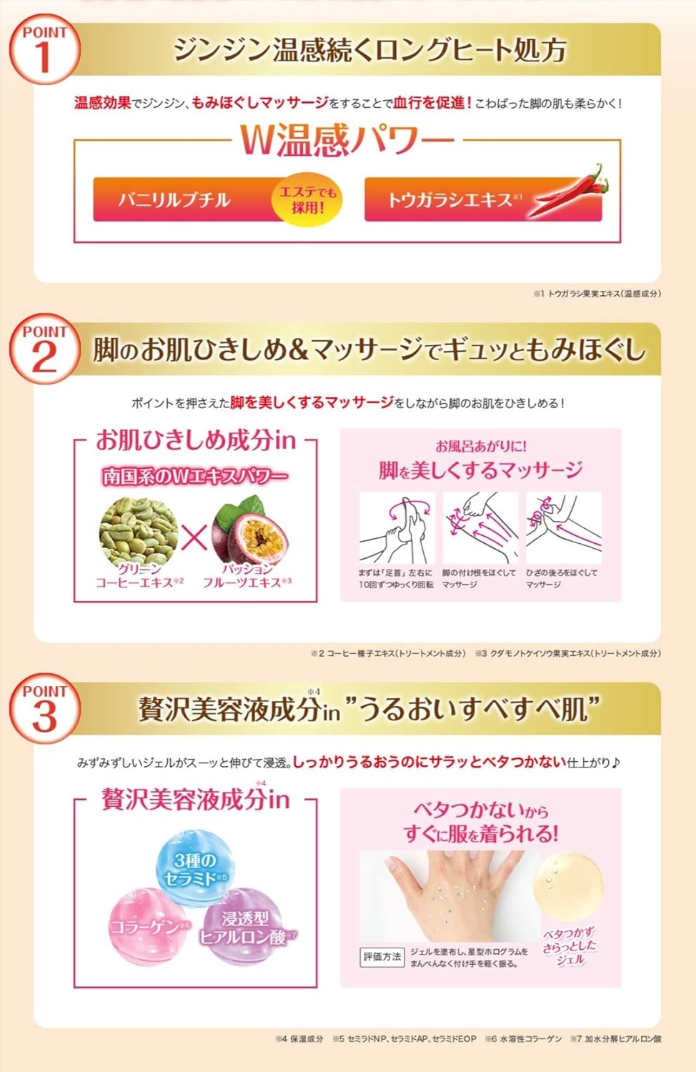 SANA Esteny 熱感瘦腿精華 190mL 🇯🇵日本製造🇯🇵 主打 「腿部熱感集中護理」,結合溫感、緊緻與保濕三大功效,讓你在家就能輕鬆完成專業級的美腿保養! 一瓶搞定腿部所有需求,讓你在家就像在沙龍做 SPA!🛁✨ 1️⃣ 持久溫感按摩 採用「長效溫感配方」,含辣椒果萃取與香草醛丁醚等成分,按摩時能促進血液循環,舒緩腿部僵硬肌膚,感受溫熱放鬆感。 2️⃣ 緊緻肌膚 + 按摩手法 添加綠咖啡萃取與百香果萃取等天然植物成分,配合專為腿部設計的按摩手法,邊按邊緊緻,幫助塑造美麗腿型。 3️⃣ 潤澤不黏膩的美容液 質地為清爽凝膠,富含3種神經酰胺、滲透型膠原蛋白與玻尿酸,保濕力強卻不黏膩,浴後使用即可快速穿上衣物,超級方便! ⭐️使用方法: 沐浴後,取適量塗抹於腿部,依照建議手法進行按摩:從腳踝旋轉開始,再到腿部後側與根部,輕鬆完成全面護理。