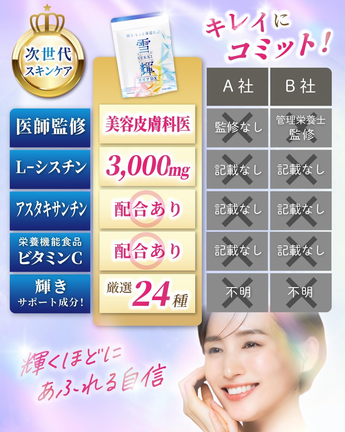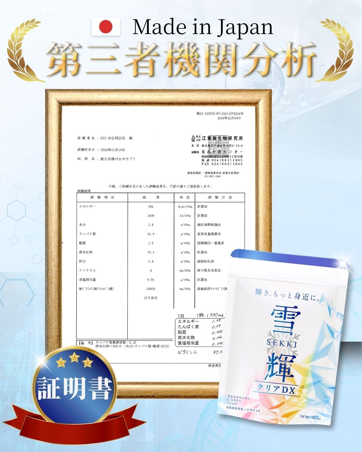 SEKKI 雪輝 防曬美白丸 30粒30日量 🇯🇵日本製造🇯🇵 由美容皮膚科醫生監修,專為現代生活設計。一年四季無論室內外,陽光中的紫外線皆可能對肌膚造成影響。本產品從內在提供全面防護,每包含有3000毫克高濃度維生素C,結合L-胱氨酸、蝦青素與薏仁等核心成分,幫助肌膚抵禦光老化。 即使在繁忙的日子裡,也能輕鬆便捷地使用。蘊含四種精選新鮮成分,奢華配方,由內而外滋養美麗。展現青春亮麗的容顏。 蘊含植物精華,讓肌膚更透亮。蘊含11種維生素、石榴、亮膚鳳梨等天然美容成分。 本產品在日本GMP認證工廠生產,品質管控嚴格,從原料入庫到生產製造,始終保持高品質。 不含香精、色素、防腐劑等15種添加劑。 透過科學配方的內在保養,幫助您展現透亮光采。 ⭐️食用方法: 每日2粒,請以溫水送服。