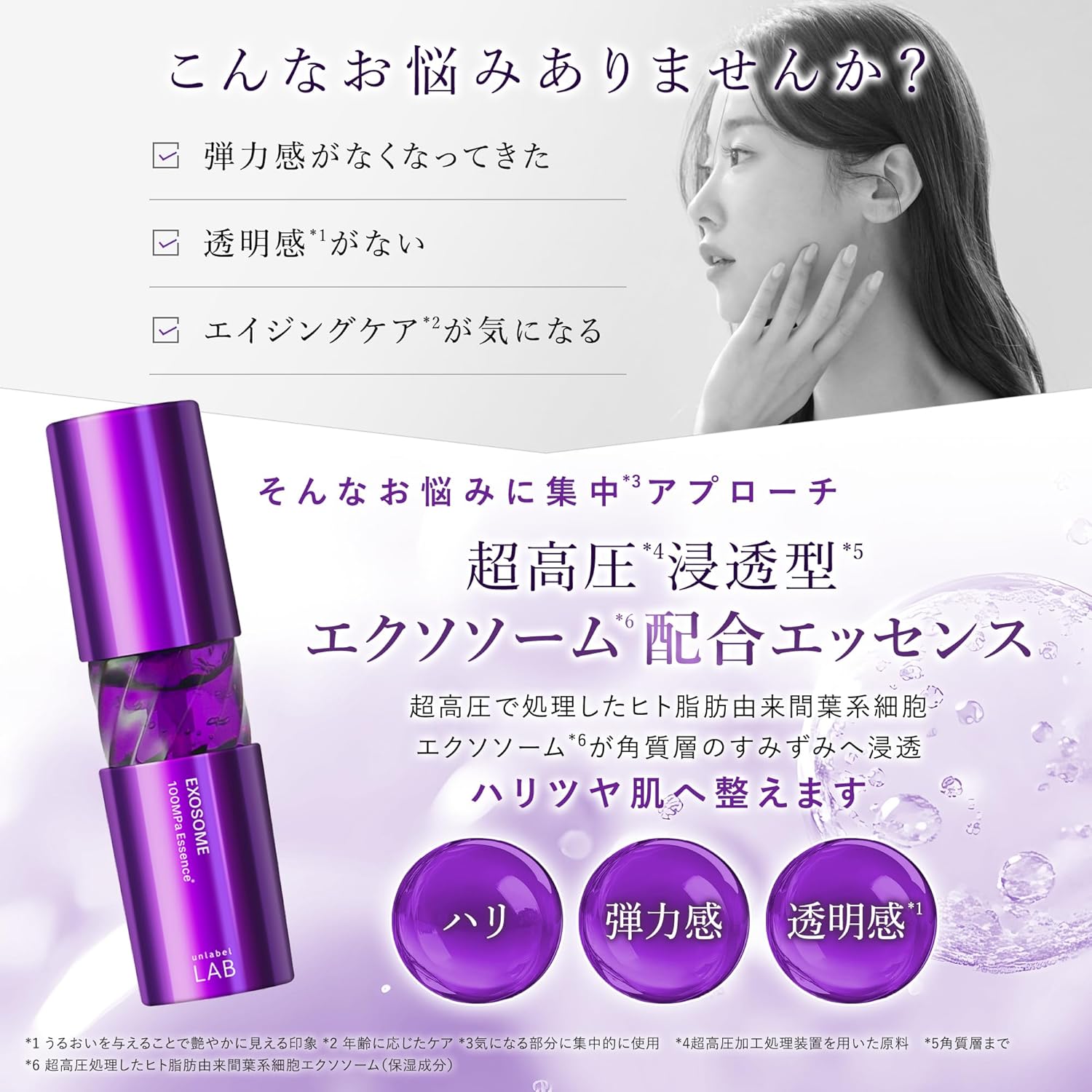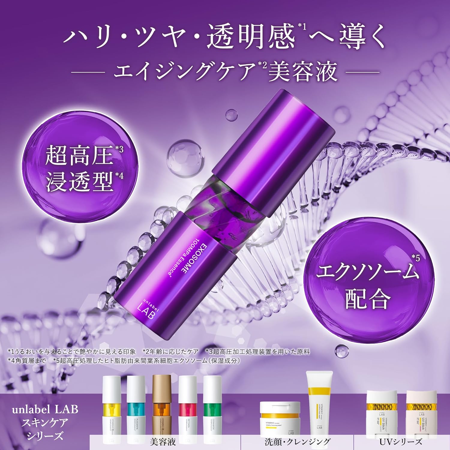 Unlabel LAB EX 抗衰老精華液 50ml ~日本製~ 這款蘊含外泌體的超高壓滲透精華液,直擊成熟肌膚問題,靈感源自再生美容技術。採用超高壓處理裝置,將保濕成分高效滲透至角質層的每個角落,滋潤肌膚,令肌膚緊緻、亮澤、富有彈性,呈現晶瑩剔透膚色。 🔘已通過敏感肌膚斑貼測試(不保證所有個體均無刺激性)。 🔘六無成分(無香料、無合成色素、無滑石粉、無對羥基苯甲酸酯、無矽油、無酒精) ⭐️使用方法: 潔面後,取適量(按壓1-2下)於掌心,輕輕塗抹於整個臉部,避開眼周。乾燥或暗沉的部位可額外塗抹。 然後,繼續進行日常護膚程序。