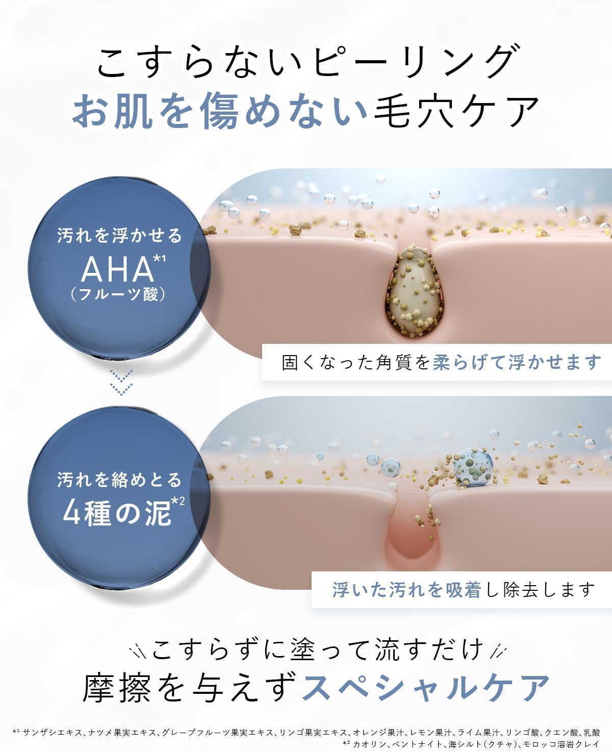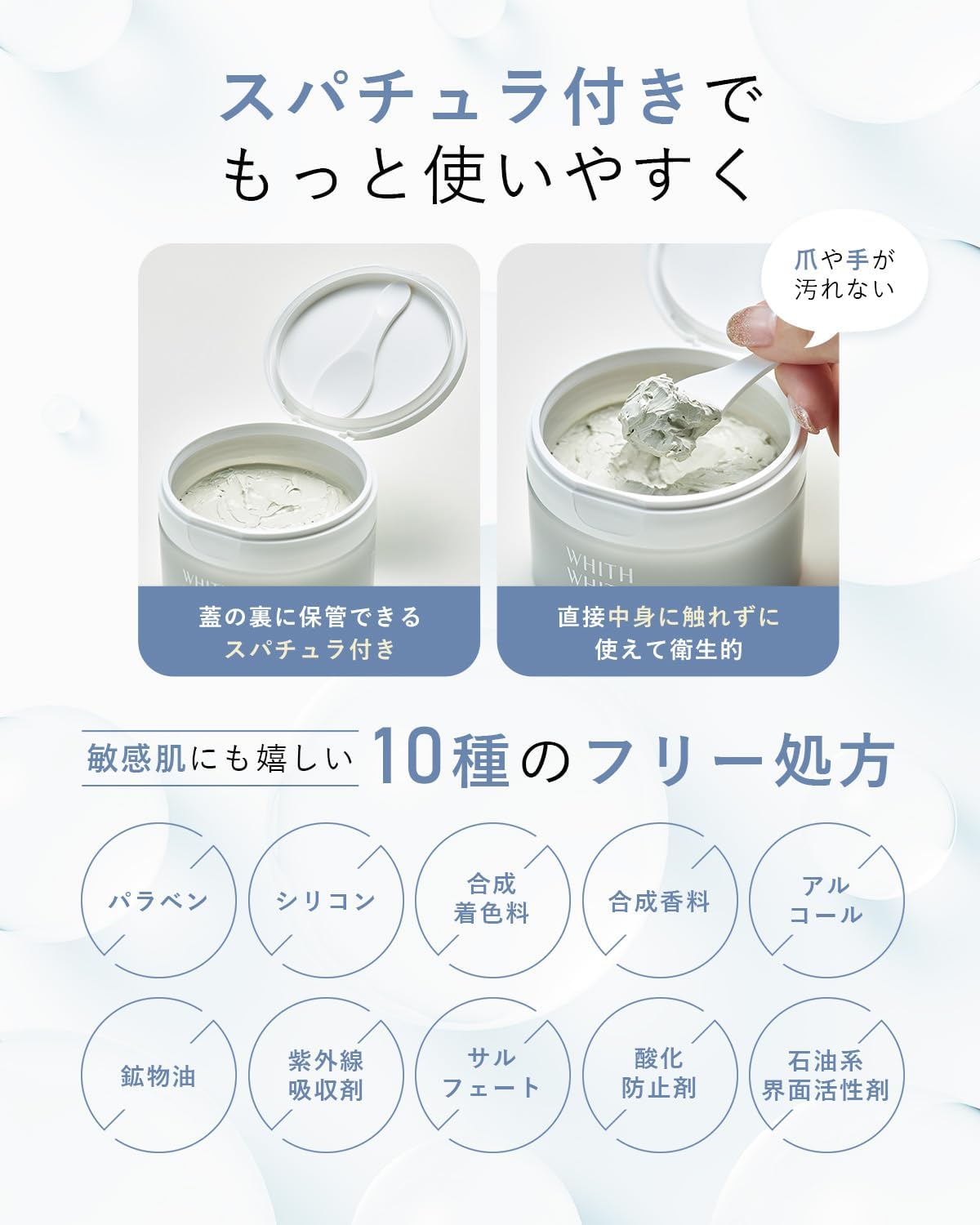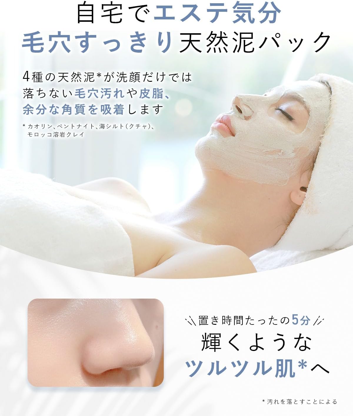 WHITE WHITE 去角質美白泥面膜 100g ~日本製~ 採用四種天然黏土:摩洛哥熔岩黏土、庫查黏土、膨潤土和高嶺土。感受如同水療般的體驗,利用泥漿的力量疏通毛孔,同時不傷害肌膚。 吸附力是活性碳的 4 倍,深入毛孔,吸收死皮細胞和多餘油脂,有效改善暗斑、暗沉和油性肌膚。其清爽的清潔效果,是痘痘肌的理想選擇。 質地柔軟順滑,極細的黏土顆粒易於鋪展,緊密貼合肌膚。溫和呵護肌膚,刺激性極低。不含酒精和對羥基苯甲酸酯。 從海底和山上採集的天然泥漿,富含對美肌有益的礦物質!還蘊含玻尿酸、膠原蛋白、5種神經醯胺等美容成分。 附贈方便小匙,可收納於蓋子內側。用小鏟從容器中舀取產品,可防止指甲弄髒,衛生使用。 ⭐️使用方法: 每周1-2次,潔面後,最適量塗抹於全臉,避開眼周及嘴部,敷3-5分鐘之後,以清水洗淨,再進行日常護膚。