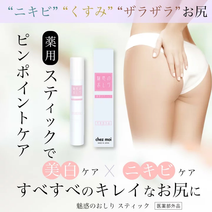 Chezmoi 魅惑 美臀精華棒『醫藥部外品』3g ~日本製~ 這款藥用棒可針對臀部痤瘡、暗沉和粗糙肌膚進行針對性護理。蘊含美白成分(抗壞血酸四-2-己基癸酸酯EX)、預防痤瘡成分(甘草次酸硬脂酯)等藥用活性成分,以及保濕成分。棒狀設計,使用方便,不會弄髒雙手。 ⭐️醫藥部外品認證: 醫藥部外品被認定為”不屬於醫藥品,但具有相當於或接近醫藥品功能的商品”,經認證配有有效成分,醫藥部外品的目的不在於積極進行治療,而在於著重預防及改善,其使用效果不會像醫藥品一樣馬上見效,但應具有可期待的效果,且效果比一般化妝品更顯著。 ⭐️使用方法: 打開蓋子後,請旋轉底部,將美容棒轉出(類似潤唇膏),直接塗抹於需要保養的部位。 ⚠️請注意轉出過多有可能會折斷。