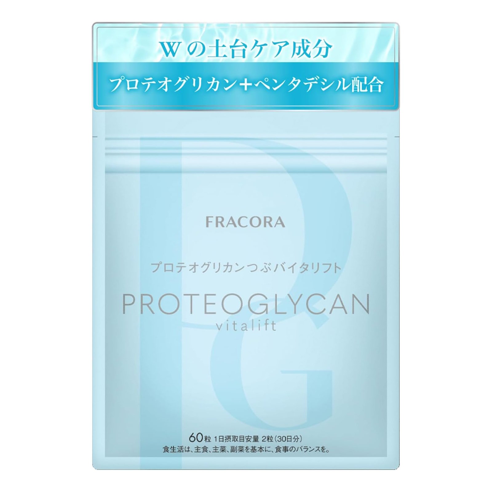 Fracora Proteoglycan Vitalift 蛋白多醣營養品 60粒30日量 ~日本製~ 根據尖端健康研究,外界刺激會累積損傷人體基礎,破壞細微處的平衡,進而影響健康和美麗。 Fracora首次將新成分「Pentadecyl(R)」作為補充劑,該成分以奈米級技術從基礎層面呵護健康和美麗。透過呵護平衡,您可以維護細微處的健康,並支持身體天然膠原蛋白的生成。這將使您從基礎開始,擁有充滿緊緻和彈性的日常生活。 蛋白聚醣廣泛分布在身體中,特別在活動部位的含量最豐富,能夠發揮緩衝作用,降低身體負擔。但隨著年齡增長,體內的蛋白聚醣會逐漸流失,增加壓力和損害風險,並影響活動舒適度,因此透過飲食額外攝取蛋白聚醣,是維持活動力的重要關鍵。 ⭐️主要成分: 含蛋白多醣的鮭魚鼻軟骨萃取物、精製金壺菌油/菸鹼酸、泛酸鈣、維生素B6、維生素B1、維生素B2(含有過敏原鮭魚、明膠) ⭐️食用方法: 每日2粒,以溫水送服,建議早起後或睡前服用。