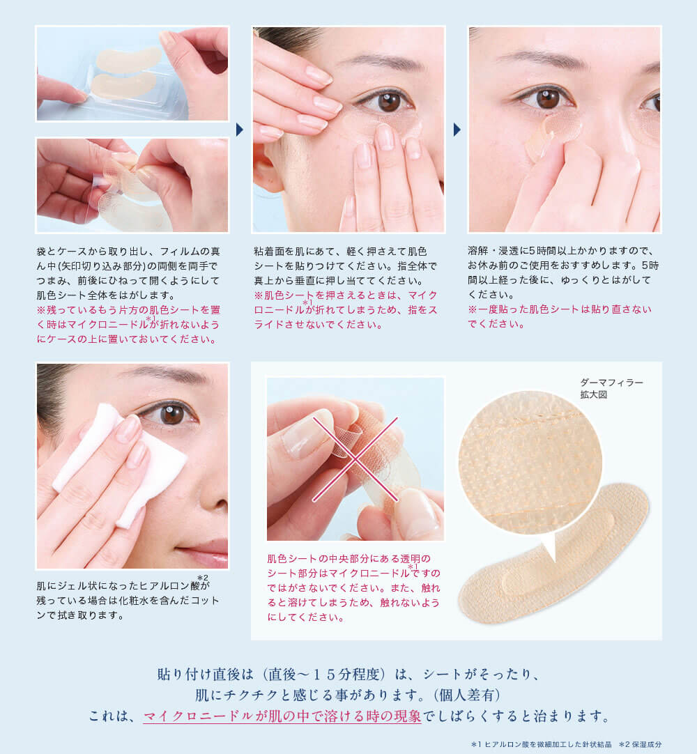 Quanis 玻尿酸可溶微針眼膜 2枚入/8枚入/16枚入 ~日本製~ 眼瞼表皮厚度小於100微米,將玻尿酸製成200微米微針直接注入真皮層,深層解善眼周問題,每片眼膜排列1300根微針,一次補充60mg玻尿酸。 請留意這款是日本版本的微針眼膜,非外銷版本,無白色水凝膠膜,白色水凝膠膜主要是為了固定眼膜,日本版本不需要這個固定就已經很貼。 微針就是透明質酸,肉眼看不見的,放大鏡要1000倍才能看到,而且毛孔的細胞是極其微小的,屬於小分子深入溶解到角質層的。 ⭐️使用方法: 潔面後,直接貼有透明黏膠那一面於下眼瞼,一定要貼5個小時以上再取下,乾性膚質可以先做塗抹眼部精華後再貼上。