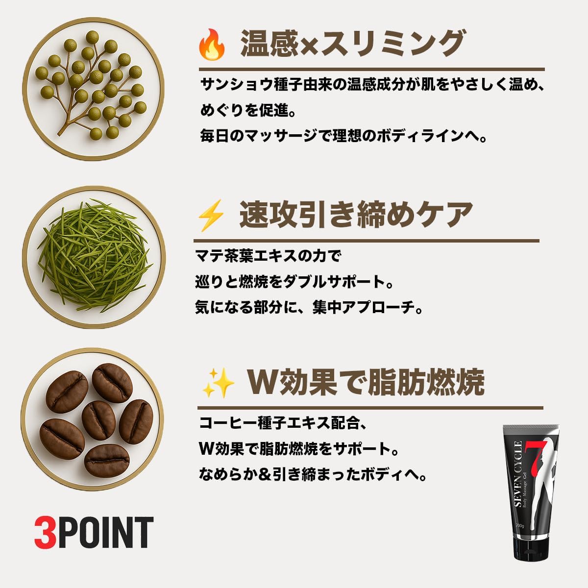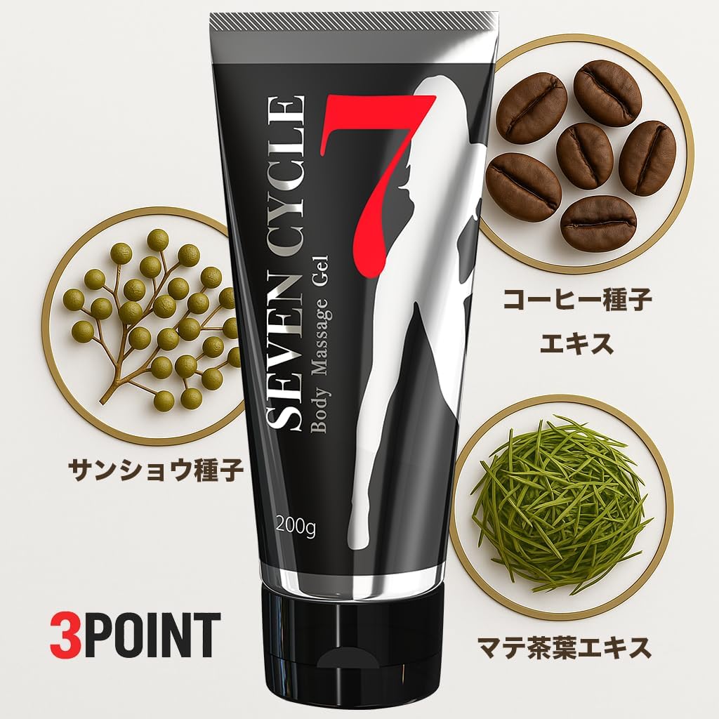 Seven 7 Break Gel SEVENCYCLE 溫熱纖體按摩GEL 200g ~日本製~ 溫熱緊緻,成就理想身材!SEVENCYCLE 溫熱纖體GEL,只需塗抹即可帶來溫熱感,促進血液循環,促進脂肪燃燒,打造更苗條、更健美的身材。 蘊含三種高濃度溫熱成分(日本胡椒籽、咖啡因和馬黛茶萃取物)。輕柔按摩問題部位,促進血液循環,排出廢物。富含抗氧化劑,還能提升肌膚緊緻度和光澤度。 還能有效消腫和消除疲勞!養成日常習慣:每天沐浴後、運動後或睡前按摩幾分鐘,即可緩解腿部和腰部的沉重感和腫脹。這款不黏膩的凝膠吸收迅速,讓您每天使用都輕鬆無壓力。 蘊含源自沙龍的成分,讓您在家中即可擁有專業級的塑身效果。男女通用的設計,男女皆宜,是您與伴侶一起進行身體護理的理想之選。 ⭐️主要成分: 咖啡因、馬黛茶萃取、花椒籽萃取、蘆薈葉萃取、透明質酸鈉 ⭐️使用方法: 1天數次,時間方便即可隨時使用,直接塗抹於想瘦的位置(面部及傷口位置禁止使用),按摩至完全吸收,5分鐘後就會開始發熱燃燒脂肪,建議按摩後包上保鮮紙。 發熱感覺每個人感受都有可能不一樣,如果擔心過份刺激,可以先塗抹少許作測試。 配合按摩滾輪及放入冷藏室冰鎮後再使用,會有更佳效果。